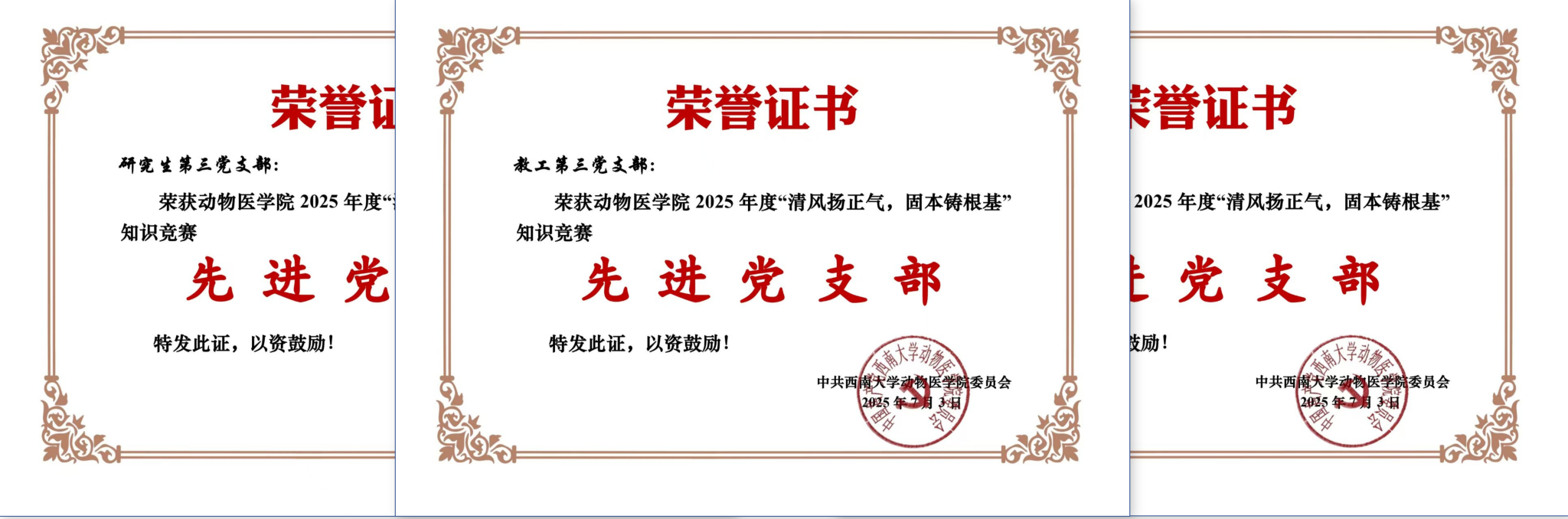 活动期间,各支部精心组织,累计收到有效答卷404份,充分现了师生对廉洁知识学习的高度重视。经综合评定答题成绩支部平均分,竞赛最终评选出教工组和员工组个人共10人获“卓越奖”27人“优秀奖”。同时,教工第三党支部、本科生第四党支部、研究生第三党支部荣获“先进党支部”。