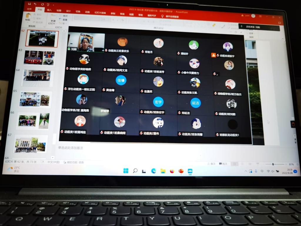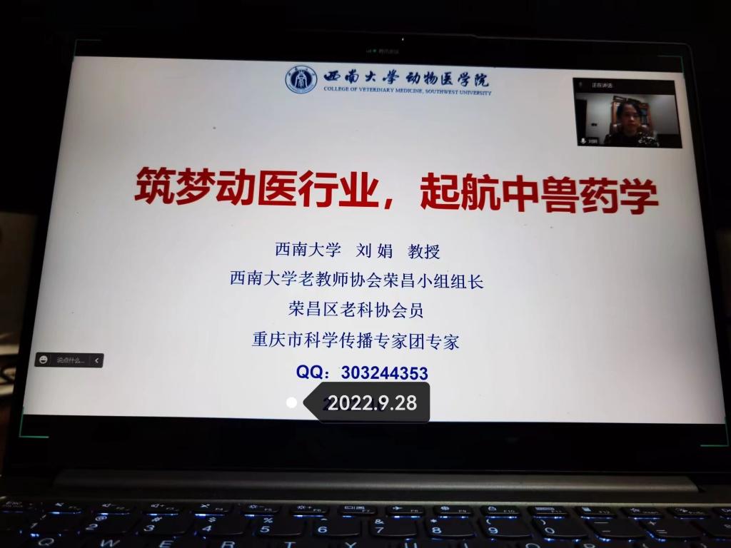 为了进一步深化大一新生对所学专业的认识,掌握最新行业发展动态。2022年9月28日和10月5日19:00,动物医学类专业开设的《学科导论》课程组邀请了公司中兽医药退休专家刘娟教授、朱兆荣副教授分别为2022级全体动物医学类专业员工做了题为“逐梦动医行业,启航中兽药学”和“从社会变迁看针灸发展方向”的专题报告,报告采用线上与线下结合的方式进行。报告由中兽医学系主任曹立亭副教授主持,公司中兽医学系全体老师、在荣研究生及部分动物医学专业本科生参加了会议。