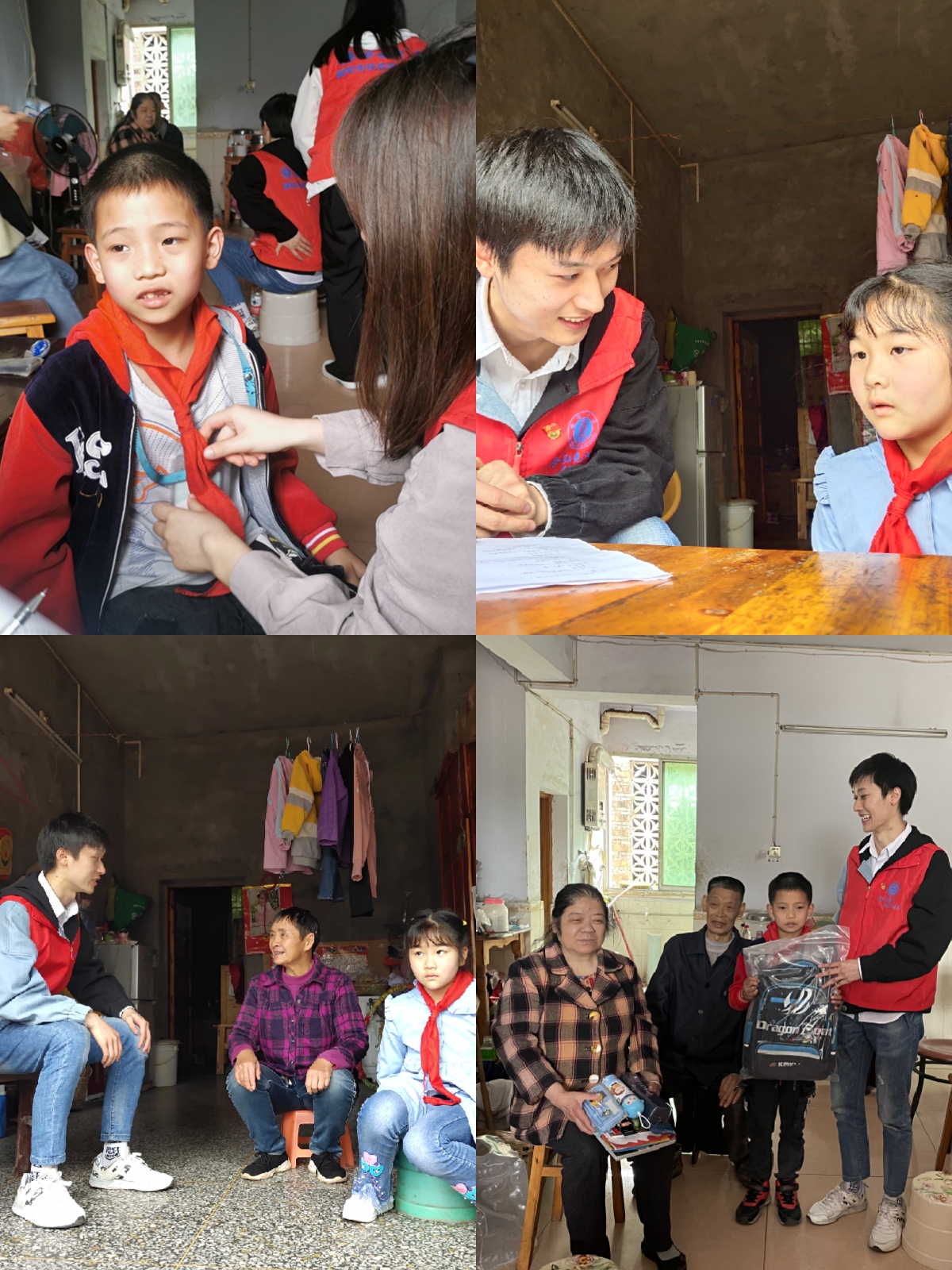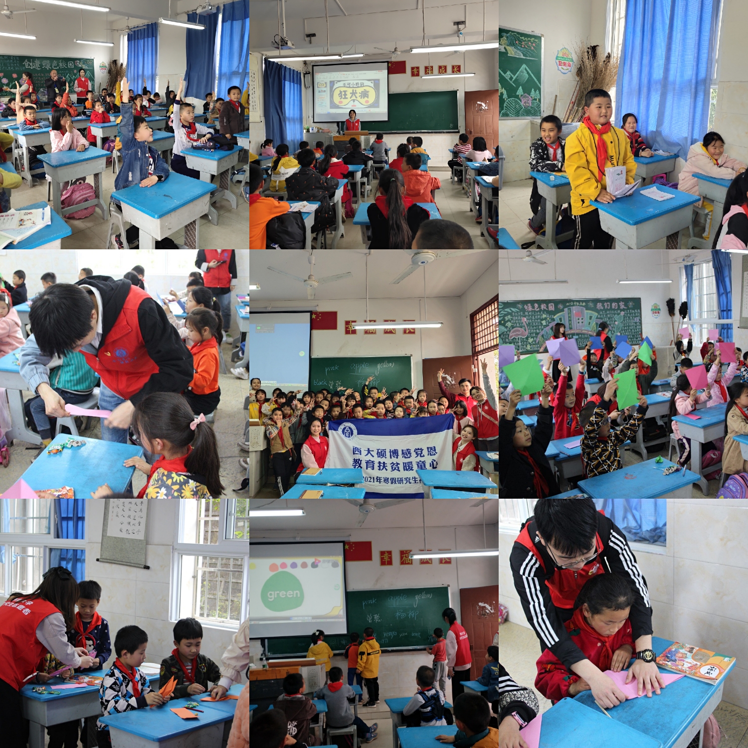 志愿者们来到铜鼓镇中心小学并了解了各年级的学习情况,分四个小组进行教学。首先是趣味英语学习,结合视频和志愿者的讲解与互动,让小朋友们喜欢上英语;志愿者通过手工教学折千纸鹤,让小朋友们写上自己对祖国、老师以及父母的祝福语,并送给他们,通过这个活动让小朋友们勤于动手并学会感恩;还有志愿者利用专业知识带小朋友们认识动物的另一面,教导小朋友们要爱护动物和它们和谐相处;另外,队员们给小朋友们讲解了狂犬病的知识,让小朋友们在喜欢动物的基础上,更要学会保护好自己。志愿者利用自己的专业知识带给小朋友们一种更奇妙的课堂体验。在课余时间,志愿者们和小朋友们在操场上打篮球等体育活动。在放学后,队员在班主任的带领下先后走访了十余户贫困员工家庭,询问孩子学习以及家庭情况、并给孩子们送去了学习、生活用品等。对于一些内向的孩子,志愿者们和他们聊天并开导。