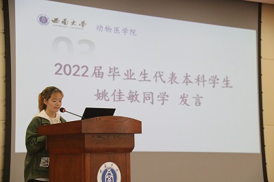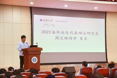 大会中,2022届硕士研究生毕业生代表周志雄同学以及2022届本科生毕业生代表姚佳敏同学,相继发表自己对就业、考研、考公的看法,以自身经历向同学们指明方向,鼓励同学们不断进步,取得一份满意的大学答卷。