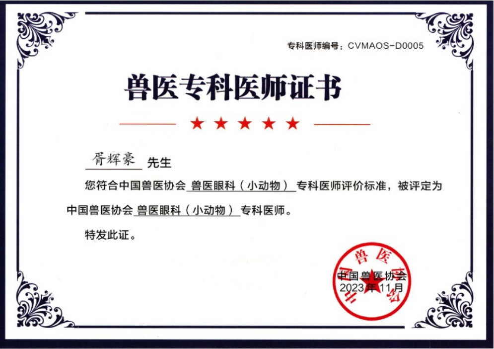 作为本次年会的一大亮点,中国兽医协会宣布了兽医眼科专科医生名单,并隆重颁发了相关证书。胥辉豪成为首批中国兽医学会兽医眼科(小动物)专科医师,他深刻认识到未来兽医发展的必然方向是专科化。作为小动物临床医学与眼科学骨干,胥辉豪深感责任重大。他表示将更加努力承担相关团队建设工作任务,进一步奠定公司小动物眼科学在国内与国际地位,并培养高素质人才。