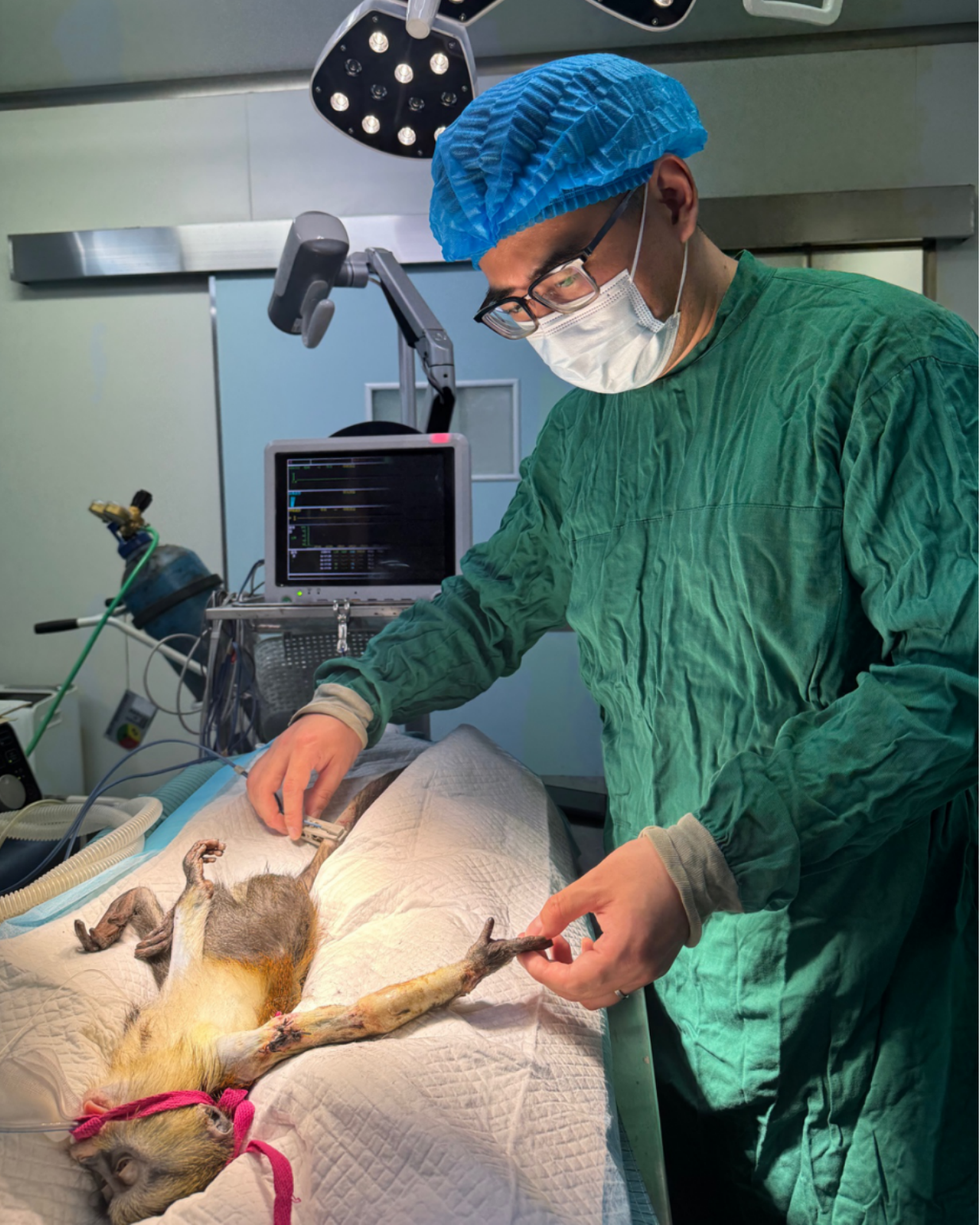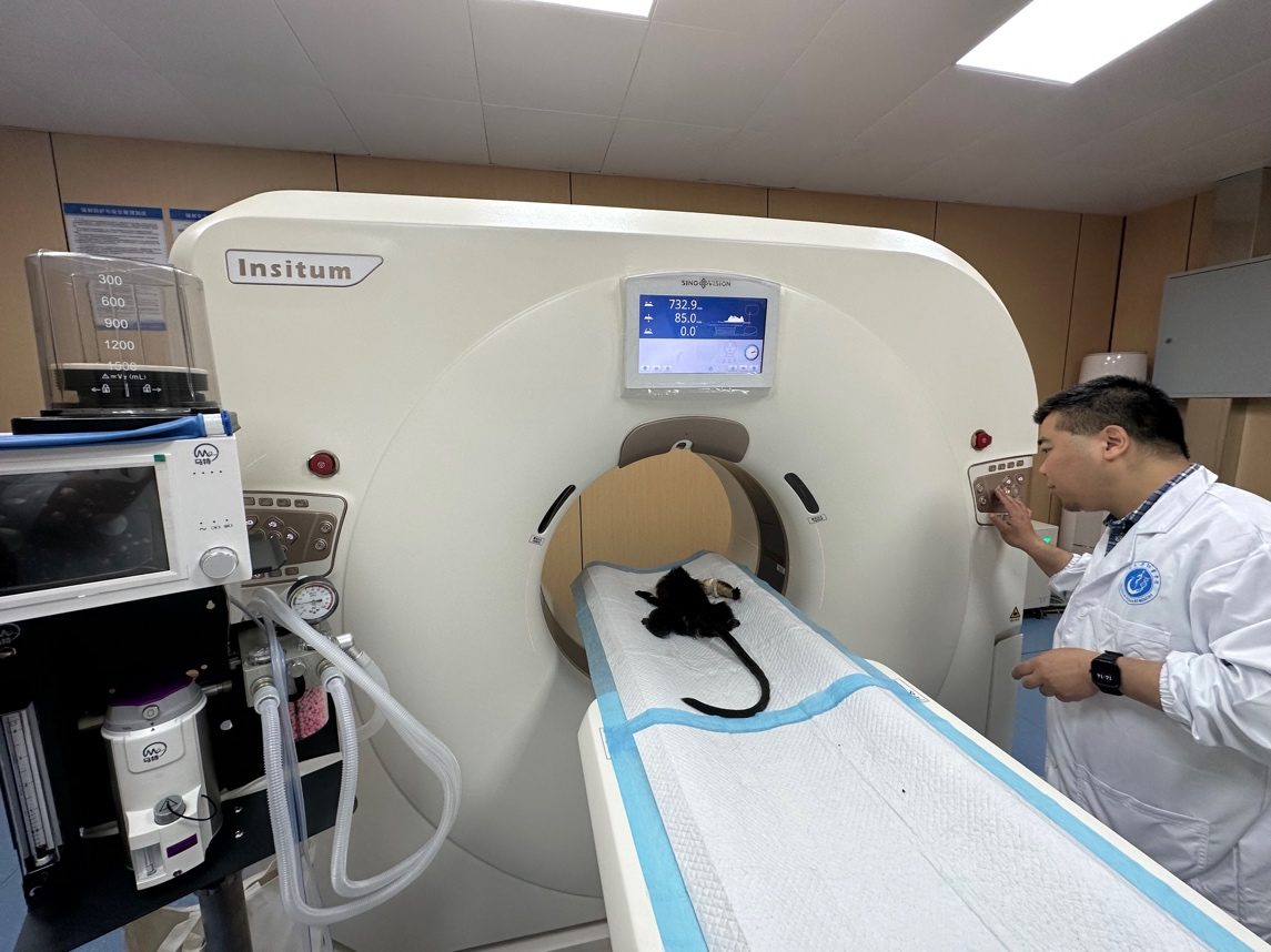 公司动物医院胥辉豪经理接诊后,马上对患病动物进行了临床检查,并借助CT对骨折部分进行了扫描,确认了两前肢断裂的情况,拟定了治疗方案。