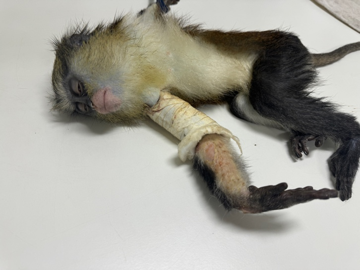 2024年4月16日,重庆野生动物世界一只前肢裹着绷带的猴子被饲养员紧急送至公司救治。此猴为加纳长尾猴,来源于非洲,两年前落户到重庆。其主要生活于西非雨林地区,分布在塞拉利昂、利比里亚、和加纳等地,体毛大部分为黑色,面颊和腹部白色,眼上方有新月形的白毛,眼周围皮肤黑色,口鼻部皮肤为肉红色,尾巴较长。因其新月形的白色眉带好似罗马神话中月亮女神戴安娜的弓,因此也被称为戴安娜长尾猴,属于《世界自然保护联盟》濒危物种。该猴于数天前因发情期争夺配偶,导致受伤。由于一侧前肢开放性骨折,伤势较重,动物园兽医团队进行了紧急处置,但猴子生性活泼好动,效果不佳。