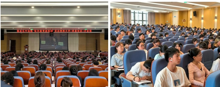 2024年6月14日,重庆市第五中级人民法院将法庭通过“线上+线下”的形式公开开庭审理了一起以介绍暑期工为名的诈骗案。bevictor1946韦德官网组织500余名本科生通过视频连线方式旁听了庭审及现场普法宣讲。本次活动使同学们生动直观的感受到司法机关对于诈骗这类违法犯罪行为的严厉打击,认清各类暑假兼职及就业陷阱,增强防骗意识。