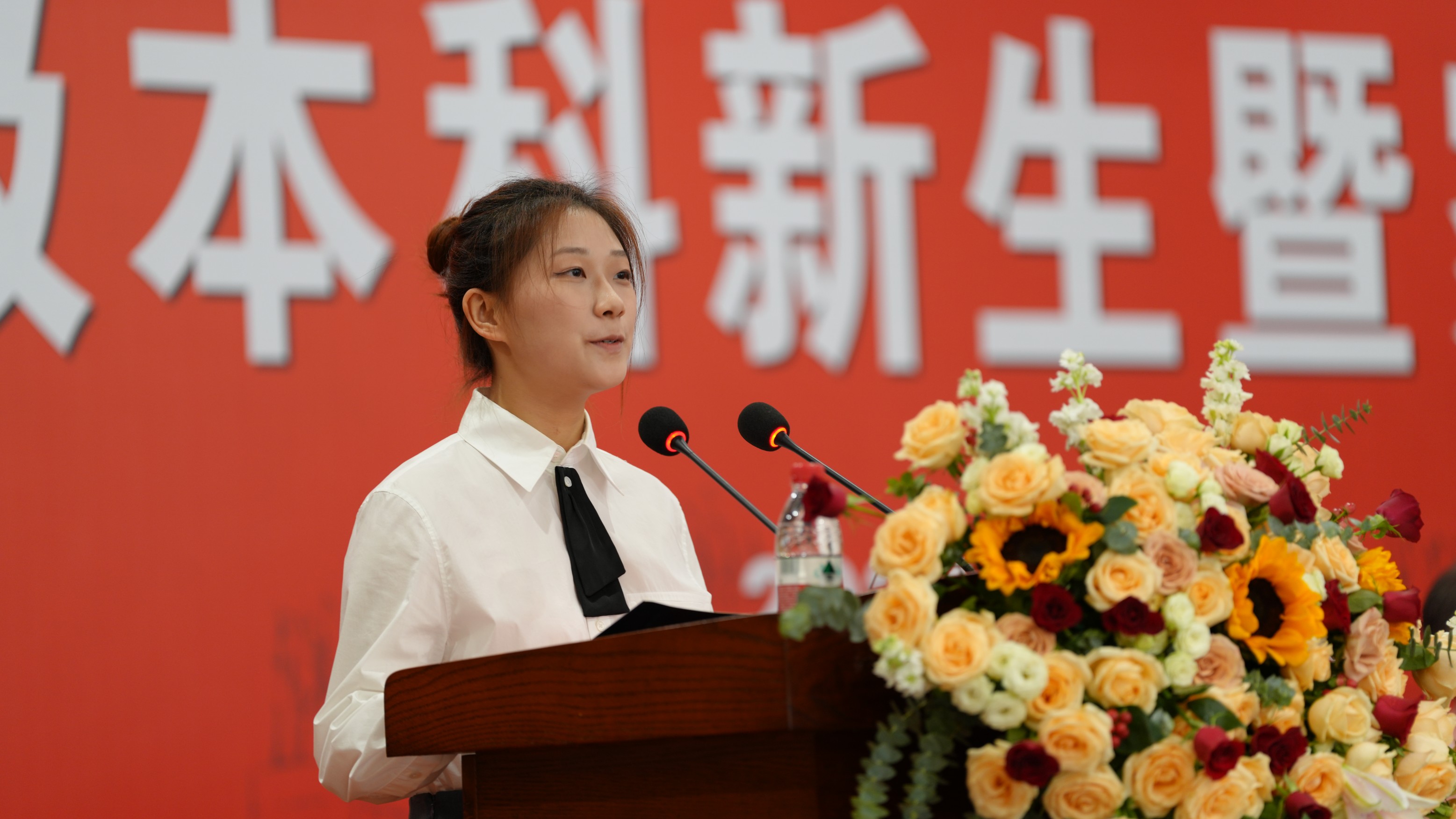 王梓蒙同学代表新生发言,她讲述了自己的奋进历程,并代表2024级新生进行了表态,坚定信念,步履不停,风雨兼程达心之所向,扶摇直上展似海前途,以青春之名,铸就时代之基。