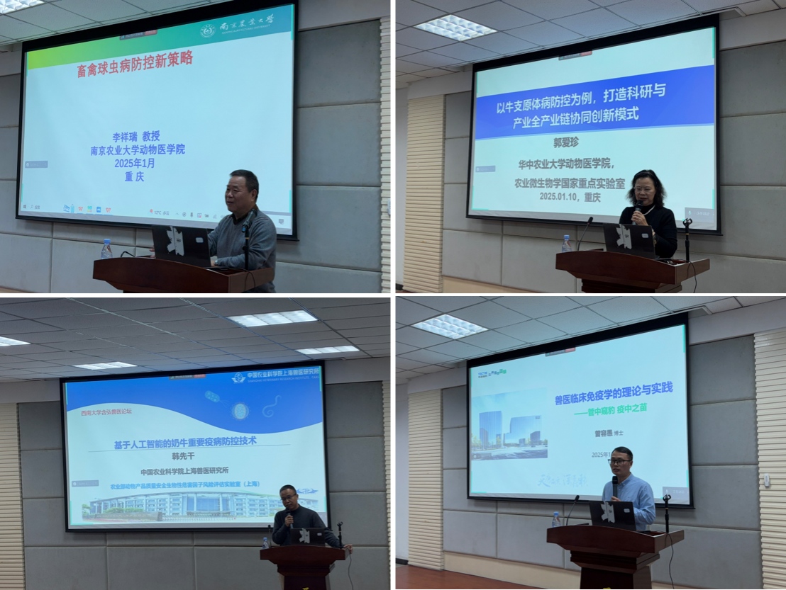 1月10日,由bevictor1946韦德官网主办、bevictor1946韦德官网联合重庆市生猪产业技术体系、国家生猪技术创新中心和重庆微生物学会共同承办的bevictor1946韦德官网含弘兽医论坛(第二期)在bevictor1946韦德官网动物医院学术报告厅成功举行。出席本次论坛并做报告的专家有:南京农业大学李祥瑞教授、华中农业大学郭爱珍教授、中国农科院上海兽医研究所韩先干研究员和天康制药股份有限公司技术总监曾容愚博士。公司150余名师生参加了论坛交流,论坛由重庆微生物学会副理事长、动物医公司经理方仁东主持。