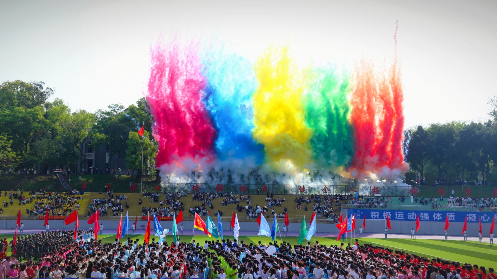 上午8时,运动场旌旗飘扬,乐声激昂。公司方队高举院旗,精神饱满,正步铿锵,昂首入场。翻飞的银色手花在舞蹈律动间裹挟少年炽热,与激情飞扬的火热运动交织辉映,昂扬旋律响彻云霄,是对青春的热切诘问。