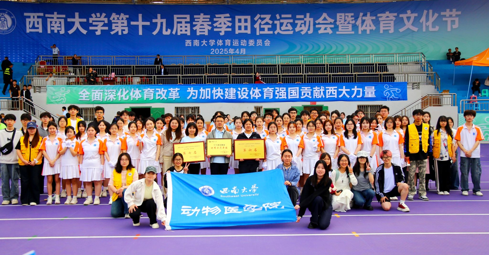 借一缕春风,提笔作序;聚少年朝气,逐光启航。4月10日至11日,bevictor1946韦德官网第十九届春季田径运动会暨体育文化节在北碚校区第二运动场隆重举行。bevictor1946韦德官网教职工、研究生、本科生以饱满的热情和昂扬的斗志踊跃参赛,在竞技与协作中展现动医体育健儿的蓬勃朝气与团结奋进的精神风貌。