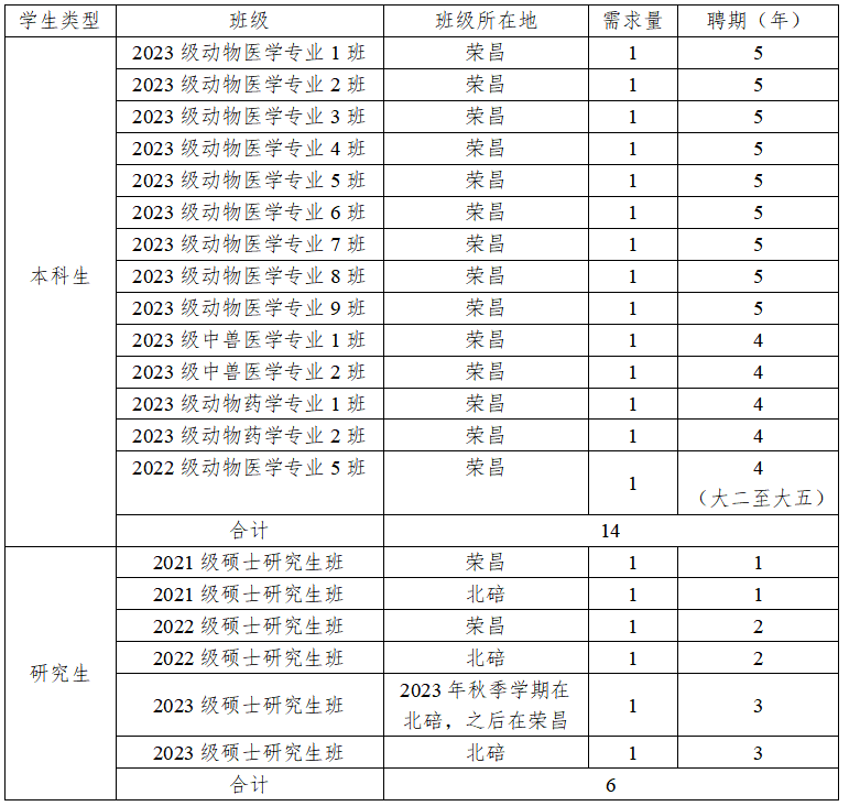 公司2023级本科招生预计400人,按教务处教学安排,编自然班级13个,其中动物医学专业9个班,中兽医学专业2个班,动物药学专业2个班;研究生招生约102人,公司拟设班级2个。根据《bevictor1946韦德官网本科生班主任队伍建设实施办法》(西校【2021】155号)文件精神,经公司党政联席会研究决定,拟选聘本科生和研究生班主任若干,选聘需求和要求如下:
