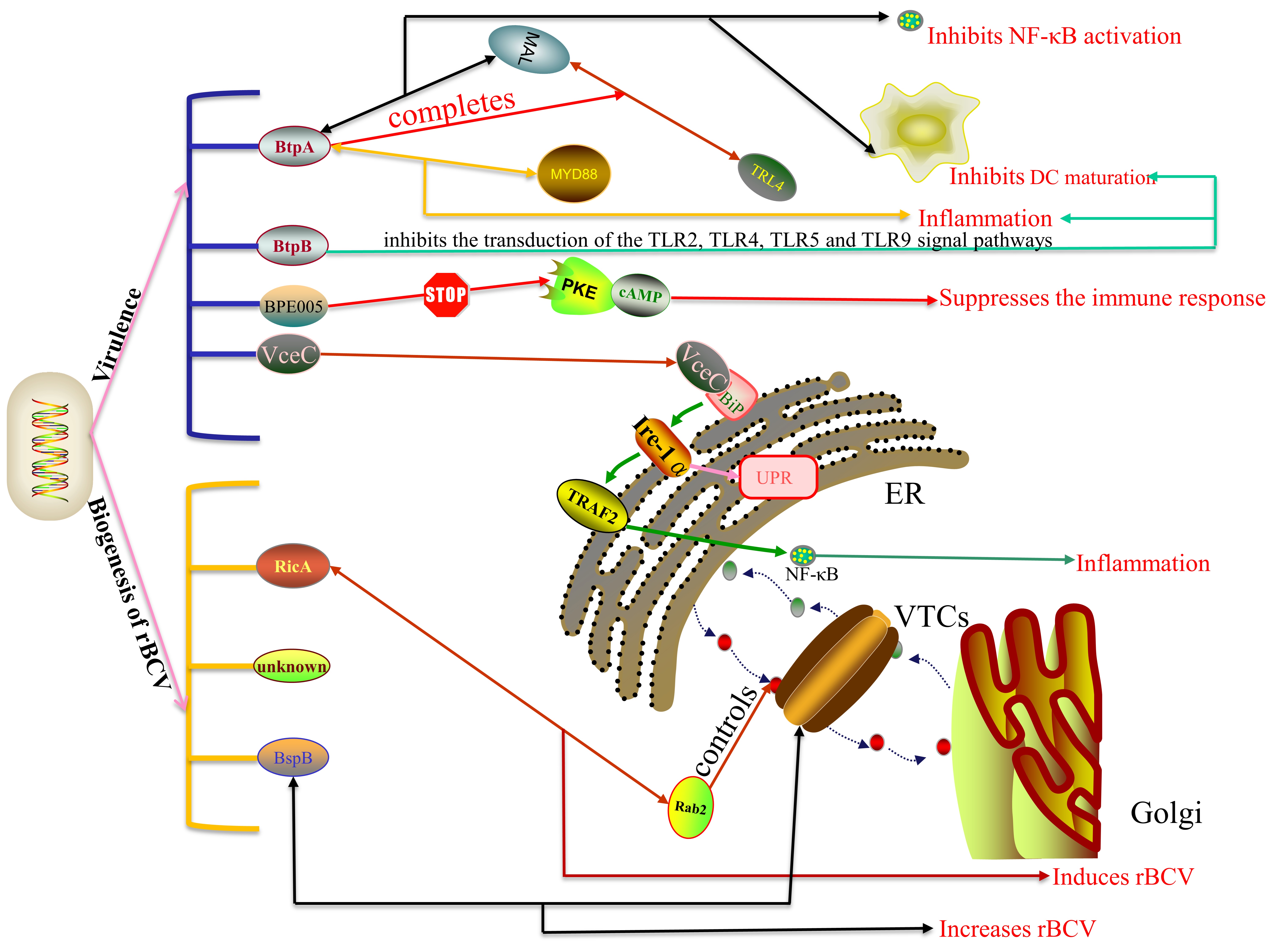 T4SS由VirB操纵子编码而成,通过分泌效应蛋白调节宿主细胞通路,从而产生两方面的作用:一是对布鲁氏菌毒力的影响,二是对rBCV形成的影响。目前已知的效应蛋白有15种:RicA, VceC, VecA, BtpA, BtpB, BspA, BspB, BspF, BPE005, BPE123, BPE043, BPE275, SepA, BspC和BspE。