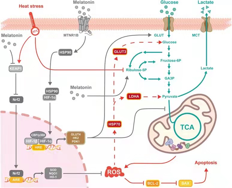 在本研究中,课题组人员利用本实验室构建的体外热应激模型,采用代谢组学与转录组学相结合的方法,发现热应激处理睾丸支持细胞抑制了磷酸戊糖途径,降低了线粒体膜电位,上调了细胞的糖酵解率,并因此导致细胞凋亡。在使用褪黑素后,细胞内抗氧化信号通路被激活,同时糖酵解途径以不同于热应激的模式被上调,磷酸戊糖途径被增强,线粒体膜电位保持稳定,细胞增殖相关基因表达被上调。进一步的研究表明,褪黑激素通过 MTNR1B-HSP90-HIF-1α信号轴实现了对支持细胞葡萄糖代谢的重编程。该研究揭示了热应激和褪黑素处理后的能量代谢的变化,对于深入认识热应激的病理机制,拓展褪黑素在生殖健康领域的应用具有重要意义。