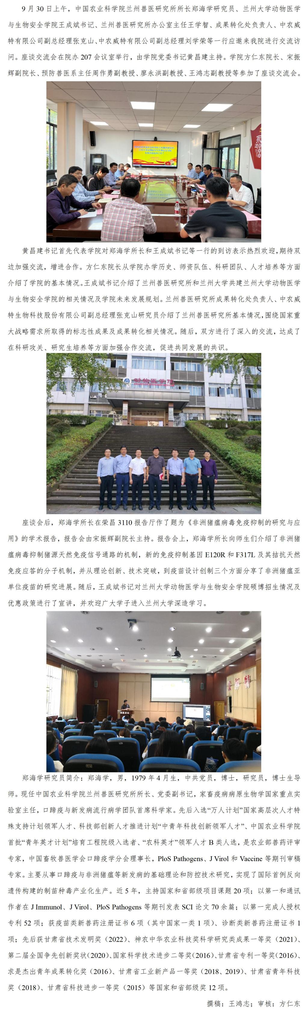 中国农业科公司兰州兽医研究所郑海学所长一行来公司交流并作学术报告