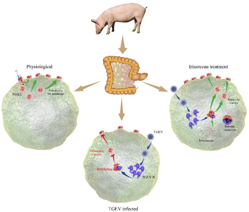 TGE的病原是猪传染性胃肠炎病毒(TGEV),属于冠状病毒科冠状病毒属,可导致猪小肠粘膜上皮细胞发生电解质转运障碍。宋振辉教授课题组在筛选TGEV感染猪小肠上皮细胞中差异表达的蛋白时发现Na+/H+交换体3(NHE3),在TGEV诱导细胞Na+转运障碍过程中发挥重要作用,进一步研究发现,TGEV N蛋白与NHE3相互作用调控细胞质膜上NHE3的表达和活性,抑制小肠上皮细胞Na+转运,促使腹泻,使用分子对接等技术筛选靶向TGEV N和NHE3互作区域的阻断剂,体内外验证该阻断剂可有效缓解TGEV诱导的仔猪腹泻。上述研究结果进一步揭示了TGE的发病机制,为研发防控该病的药物提供了新靶点。