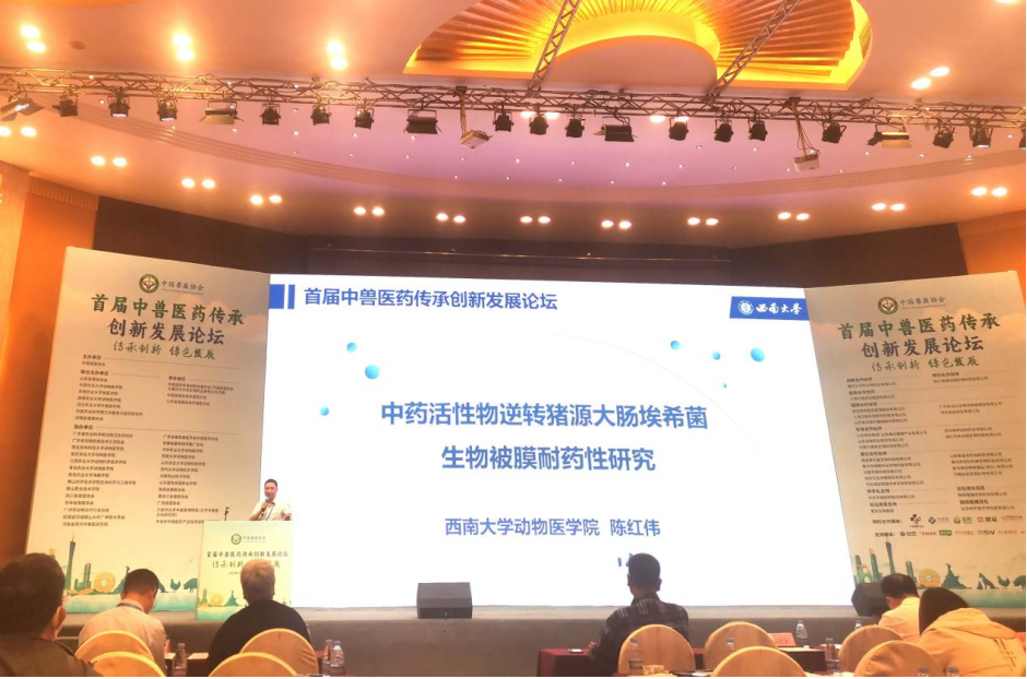 本次论坛设置“传承创新·绿色康养”、“中药资源·研发趋势”、“宠物诊疗·中兽医师”三个分会场,公司教师陈红伟副教授作为青年专家学者在“传承创新·绿色康养”专场做了《中药活性物逆转猪源大肠埃希菌生物被膜耐药性研究》的大会报告。会议现场处处洋溢着浓厚的学术氛围,来自全国各地的兽医从业者们对中兽医药的传承创新发展表现出浓厚的兴趣,学习热情高涨。