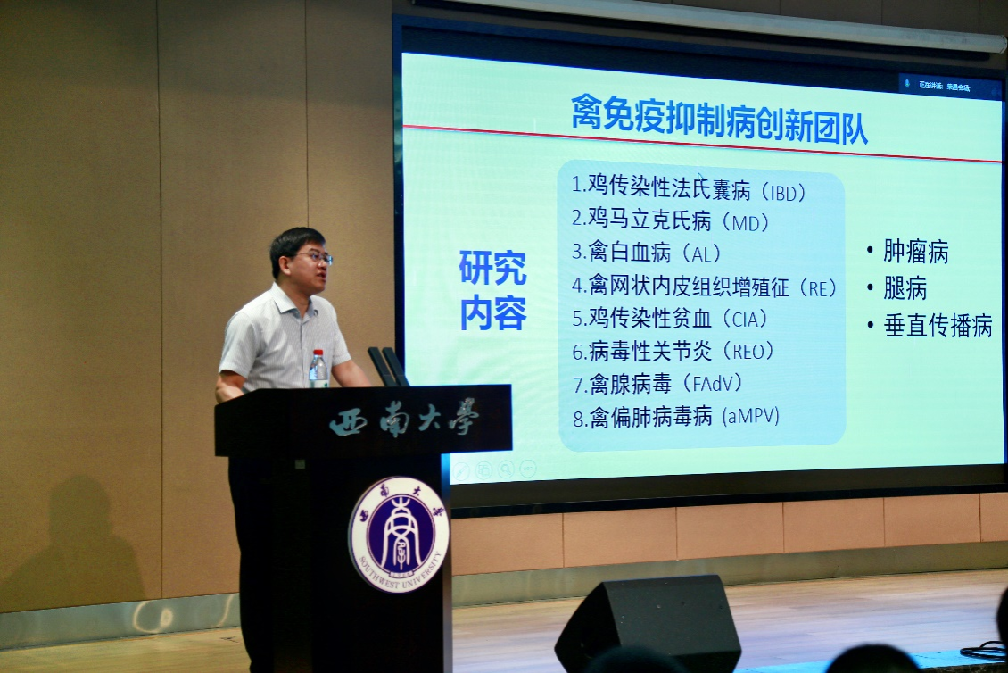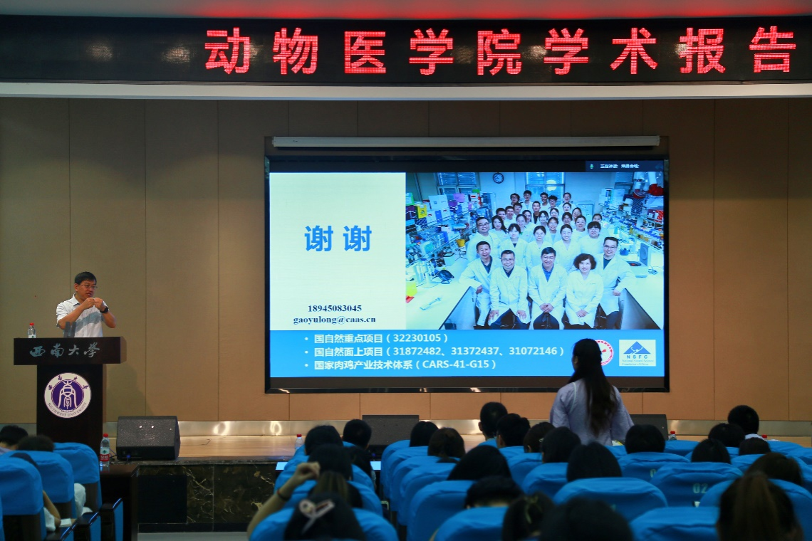 高玉龙则以“禽白血病病毒遗传变异、致病及防控技术研究”为题,全面介绍了哈尔滨兽医研究所禽免疫抑制病创新团队的人员组成,团队研究方向,以及有关禽白血病的起源、传播方式、致病特征、流行情况和种源疫病防控技术的最新研究成果,引发了师生们的广泛兴趣。